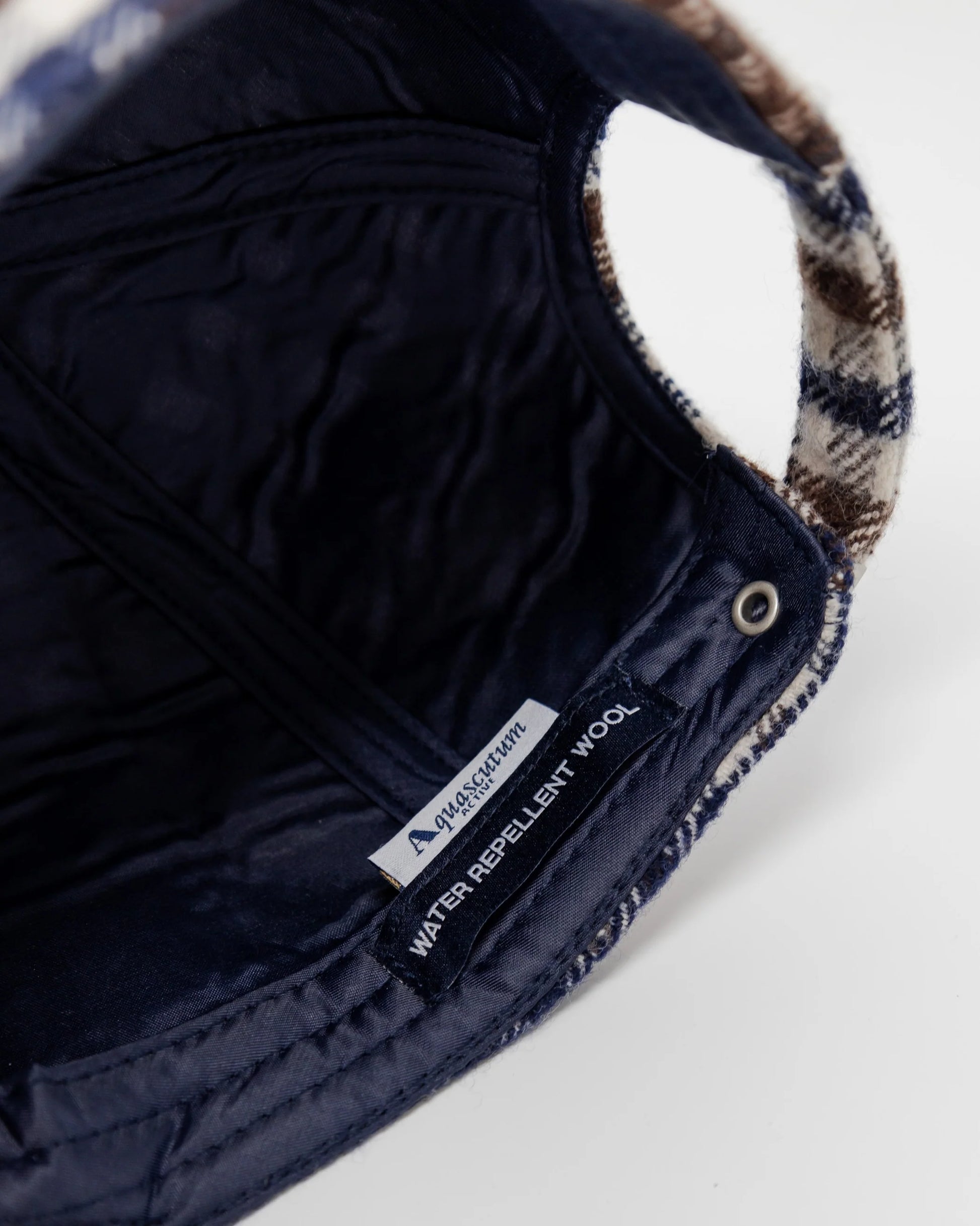 Berretto baseball in tessuto 100% Merino, smacchinato in Club Check, trattato con una leggera resinatura a spray per creare la caratteristica di articolo repellente all'acqua. Etichetta tessuto posizionata sul lato interno.
